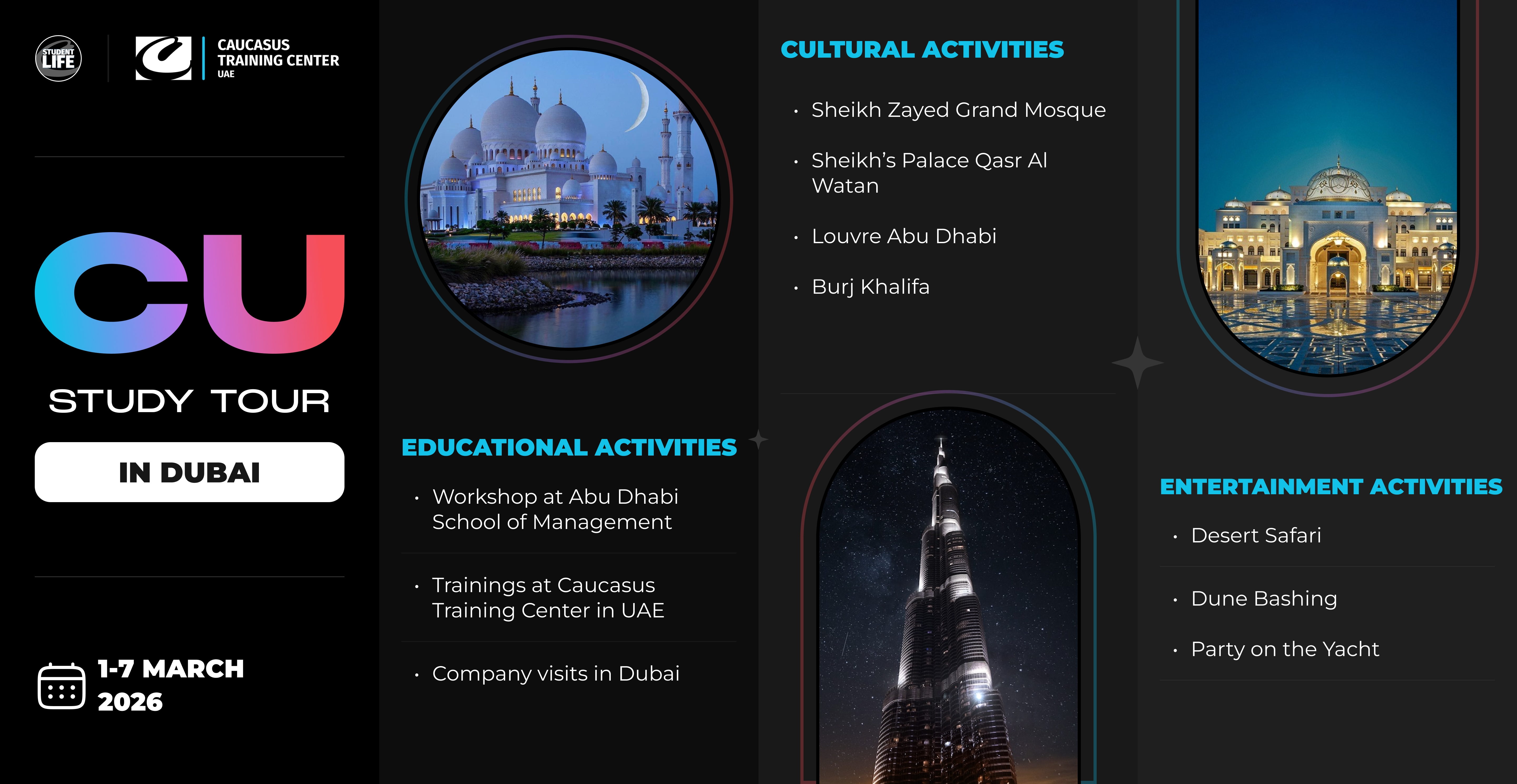 The CTC Study/Share Experience/Network in UAE Program offers participants a dynamic blend of academic enrichment, professional exposure, and cultural immersion. Designed for university students, professionals, entrepreneurs and all level of Management, the program combines specialized trainings at the Caucasus Training Center with company visits, networking events, and guided exploration of Dubai and Abu Dhabi. Through a carefully curated agenda, participants engage with industry leaders, gain hands-on insights into the UAE’s innovation-driven economy, and connect with peers from diverse backgrounds. The experience fosters personal growth, international perspective, and meaningful professional relationships that extend beyond the classroom.
